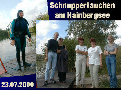 Schnuppertauchen im Hainbergsee. Einige Mutige trauen sich unter die Wasseroberfläche - aber dort gibt es nichts erfreuliches zu sehen: Autoreifen, Waschbecken, Fässer, und und und ... ! Die Seesportler planen deshalb im Herbst eine "Entrümpelung des Hainbergsees".