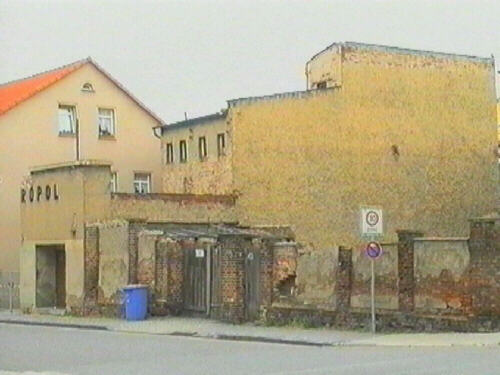 Die Reste des ehemaligen Kinos "Metropol", das 1966 geschlossen und danach bis Anfang der 90er Jahre als Turnhalle genutzt wurde. Die Aufschrift Metropol ist teilweise über dem Eingang noch zu erkennen.