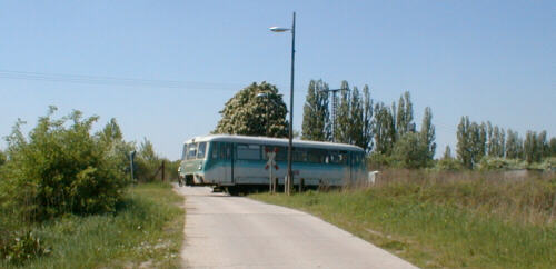 Triebwagen aus Altenburg am Bahnübergang kurz vor dem Haltepunkt.